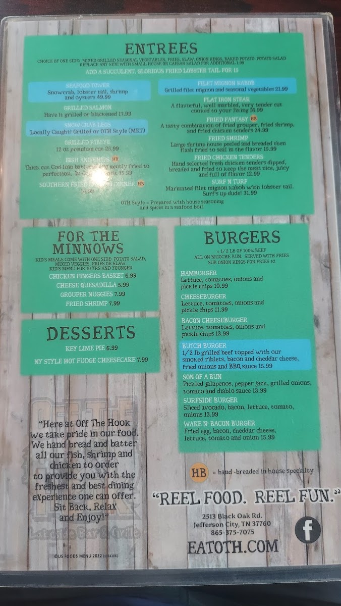 Introducing the menu at Off The Hook Lakeside Bar And Grille is a delightful experience, merging a vibrant atmosphere with a tantalizing selection of dishes. Nestled by the serene waters of Jefferson City, TN, this eatery specializes in elevated seafood cuisine, presenting a highlight: the Seafood Tower, featuring snow crab, lobster tail, shrimp, and oysters for just $49.99. For lighter fare, try the Blackened Mahi Mahi at $16.99 or kid-friendly options like chicken fingers and cheese quesadillas, ideal for the “Minnows.”